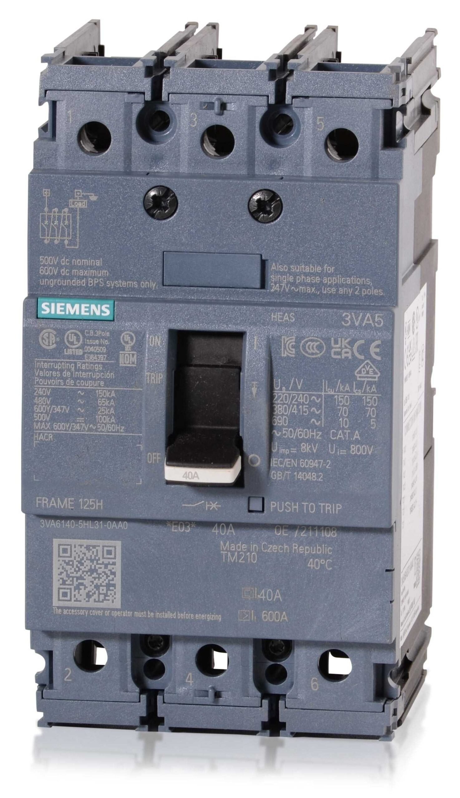 circuit breaker 3VA6 UL frame 150 breaking capacity class M 35kA @ 480V 3-pole, line protection ETU320, LI, In=40A overload protection Ir=16A…40A short-circuit protection Ii=1.5…12 x In without connection–3VA6140-5HL31-0AA0
